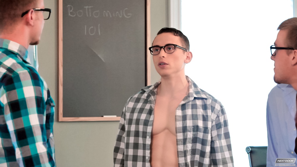 Fresh from their instructive class, Austin Storm, Dante Martin and Jaxon Colt are eager to put what they’ve learned to practice. Jaxon is a little unsure, but Austin and Dante are very studious when it comes to this sort of thing. Dante runs through his instructor’s check list, and Jaxon disappears into the restroom to douche while Austin and Dante move on to some advanced techniques, disrobing each other and beginning to grope at each other. Interrupted by Jaxon coming out of the stall, Austin and Dante shift their focus to Jaxon’s instruction. Sitting him on a chair, they both finish undressing, their cocks now at perfect chin level for Jaxon to ‘double major’. With a dick in each hand, Jaxon pulls them closer and begins to nibble on the head of each, mashing the heads together and tonguing them with a teasing hesitancy. Dante grabs the lube and bends Jaxon over the table, moistening him up as Austin grabs a dildo off the desk and begins to work it in. Jaxon moans from the penetration as Austin rams him with the dildo, but Jaxon, now adjusted and more comfortable, wants the real thing. So Austin and Dante flip him over on top of the desk and take turns pumping him full of hot hard cock. Dante pounds him as Austin slaps his cock against Jaxon’s chest, then they all move down to the floor as Austin takes his turn, before both guys shower Jaxon with a bucketful of cum that coats Jaxon’s face and sends him rushing with new found excitement, causing him to spray his own load all over his stomach. Teacher would be so proud! Enjoy!