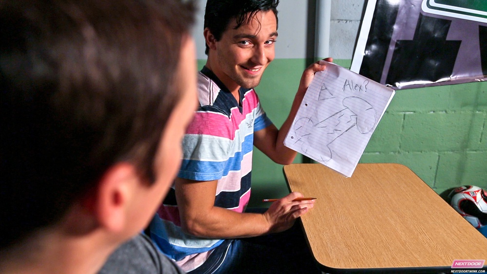 It’s another day in after-school detention for Tyler Morgan. But for goodie two-shoes, Alex Love, it’s a shameful, traumatic experience. Alex’s mom already told him that if he doesn’t use the time in detention to finish his math homework, he’s in big trouble. Tyler knows Alex has never been punished at school before. In fact, Alex has a reputation for being the teacher’s pet. Tyler’s decided to make good use of his time today too…by trying to hook up with Alex! Tyler’s the type of guy that never gives up after an initial rejection. Even though Alex fends off his first advances with scowling dirty looks, Tyler doesn’t let up. He knows the key here will be making Alex laugh. Sure enough, when he goes to the front of the room and tries on the teacher’s glasses, Alex chuckles. Tyler turns up the sexiness by lifting his shirt up and showing his midriff. Alex can’t help but pop a minor chubby. Tyler removes his shirt completely and invites Alex to join him at the front of the classroom for some sensual fun. Alex does and Tyler can’t get Alex’s sweet cock in his mouth fast enough. Alex can’t believe this is happening! The hottest guy in school, sucking his cock in detention! Is he dreaming?? Then something so epic and crazy happens, you won’t believe your eyes. Right there, on the teacher’s desk, Tyler lets Alex fuck him! Alex is blown away by how good Tyler’s tight hole feels on his swollen dick. Pounding that tender, class clown ass definitely makes getting in trouble worth it! Enjoy!