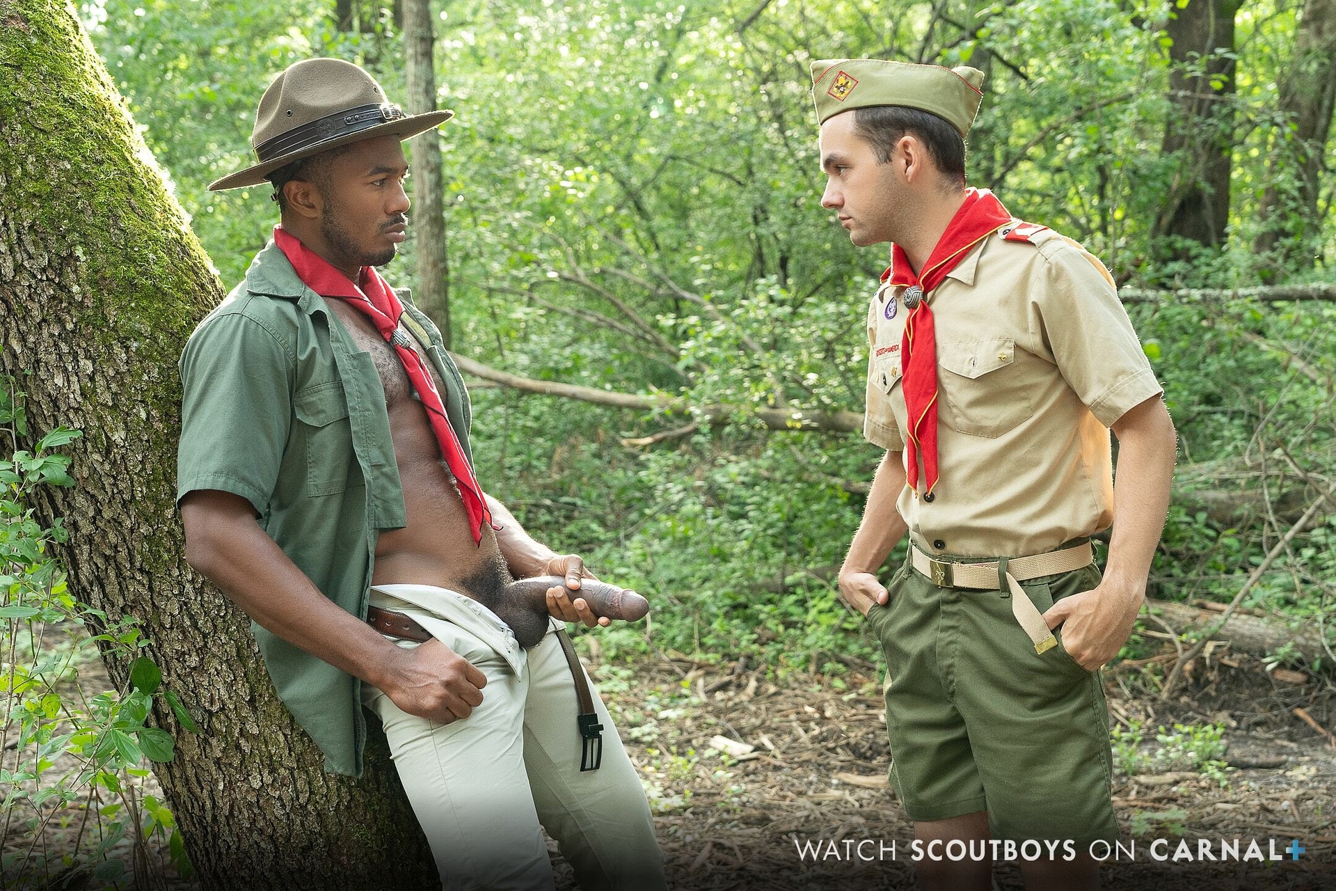 Description: I woke up with a raging morning wood, ready for some relief, but got busy helping the scouts and other scoutmasters start their day, then decided to take a walk into the woods to rub one out. While there, Scout Marcus approached me and without a word, went down on his knees to suck my large cock, but gagged every time, even when I coached him. He stood, we kissed, knowing we both were ready for the next step.