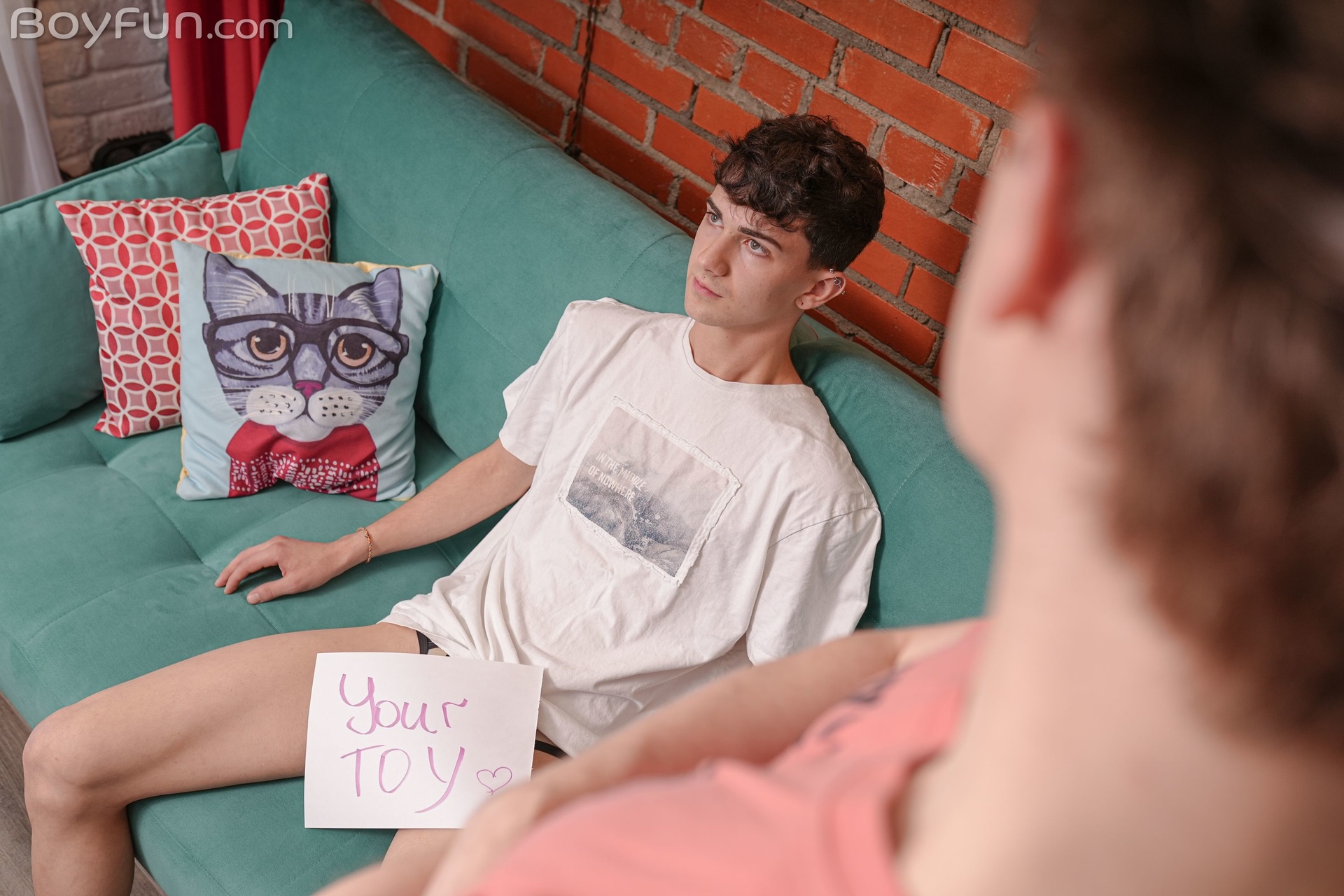 Super hot new twink boys Larry Wilson and Andrew Abbott are teaming up for this sexy BoyFun play session, with slim little Larry playing the part of a toy his pal can play with. Be honest, if you walked into the room and found Larry sitting there motionless in just a tee shirt and bulging briefs, you'd be inclined to have some fun! Andrew explores the twink "doll" and soon has his hard and drooling dong out of his pents to be slipped into his boy toy's mouth!