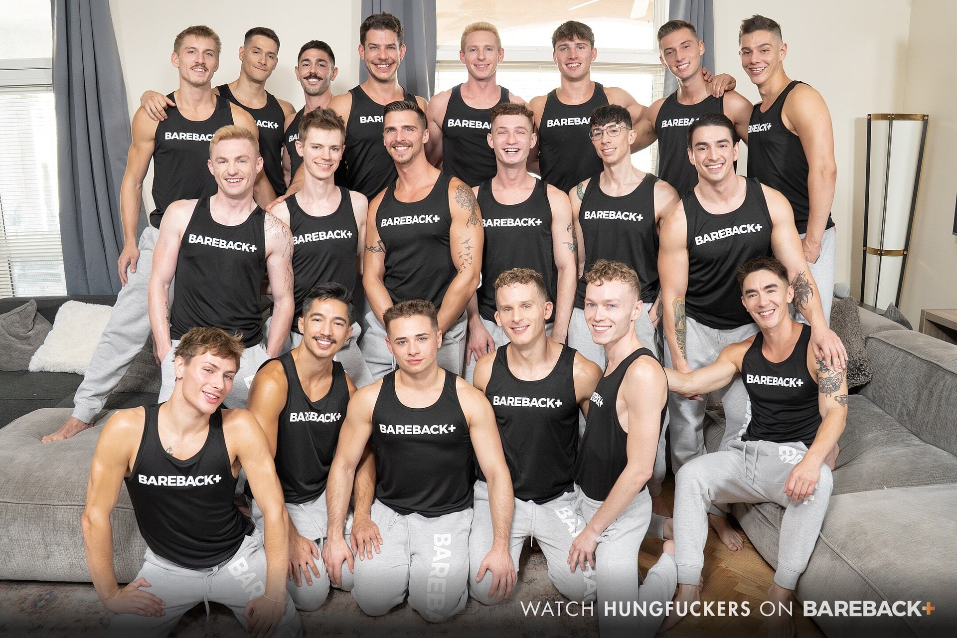 Then the remainder of the fourteen tops come in to turn this Supersized Orgy into a boiling hot suck and fuck bonanza. Throughout this huge orgy, fucking one-on-one, fuck chains, double penetration, every position imaginable, skin slapping, long dicking, moans, groans, cum flying, facials, deep breeding until all the gay men are happy, fresh fucked, no regrets, all wanting more.