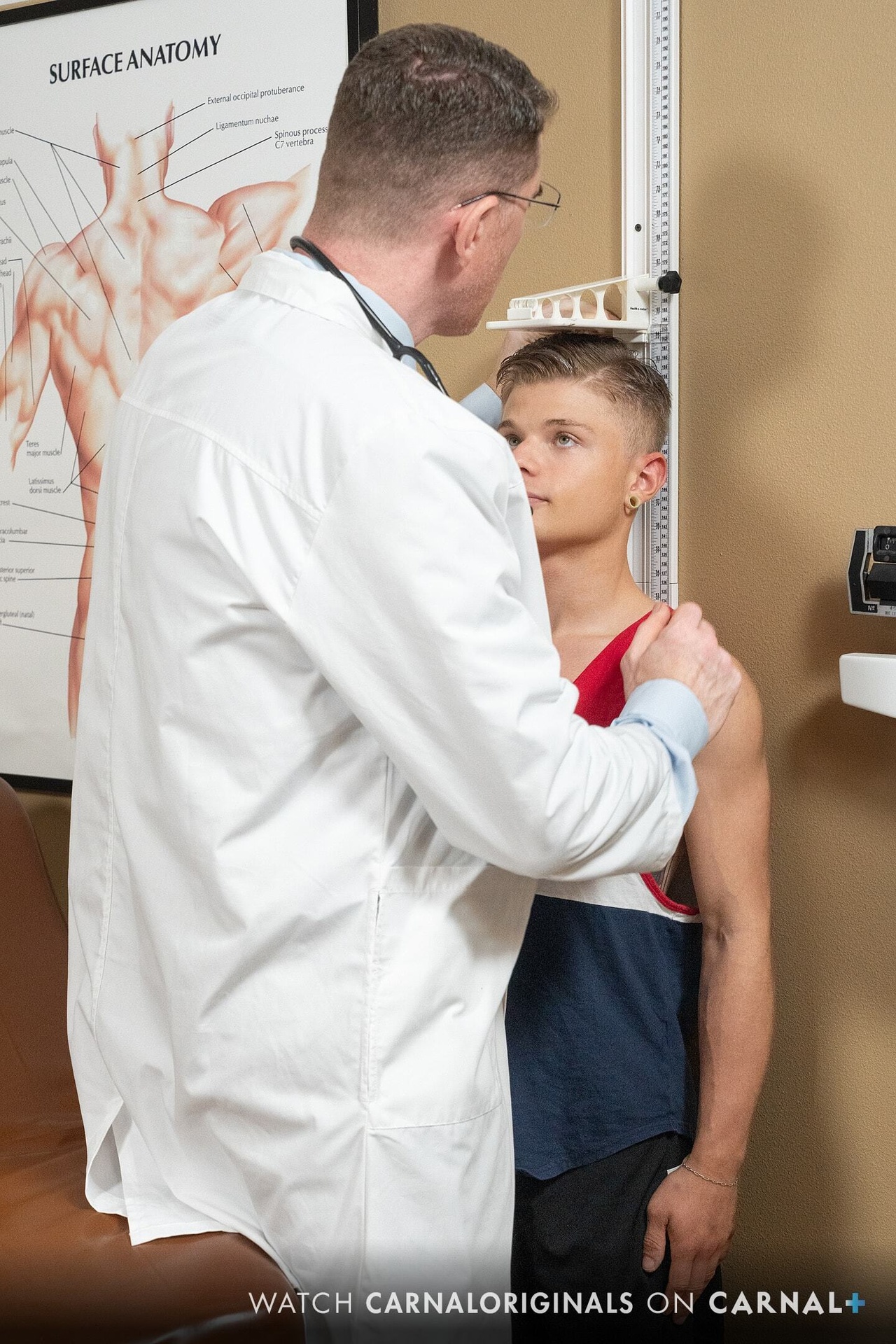 Dr. Wolf blows his mind when he pulls out the ultrasound and shows Troy what his ass looks like with a dick inside of it. Pretty soon, though, Dr. Wolf is through playing around. He’s balls deep in a hot little twink jock, and he’s going to enjoy it. He rolls the boy over on his knees and starts giving him a long, hard ride. Like most men, he wants to look his bottom in the eye when he breeds him, though. Troy is on his back again, The doctor says, “I’m going to come in you,” with that, the doctor revs up to third gear for a serious all out pounding. His hole gaping open and seed dripping down his crack, Troy is truly fucked out! Will he do it again? Probably.