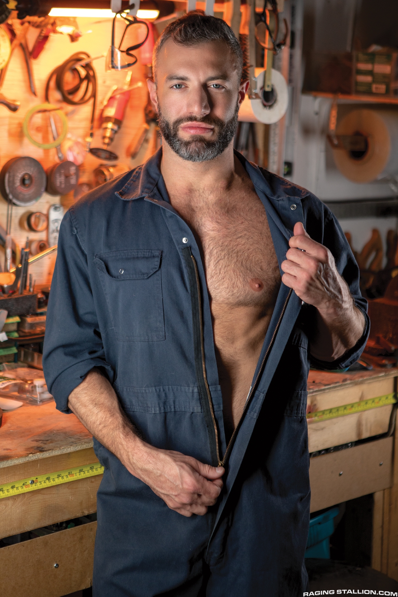 In the dead of night, an irate Cole drags head mechanic Darenger McCarthy into his RV to get some answers, but instead decides to take his anger out of Darenger's oversized cock. He swallows every inch of his mechanic's member before the long-haired, 6'4' stud ditches his greasy clothes to pound Cole's hole all over the inside of the RV.