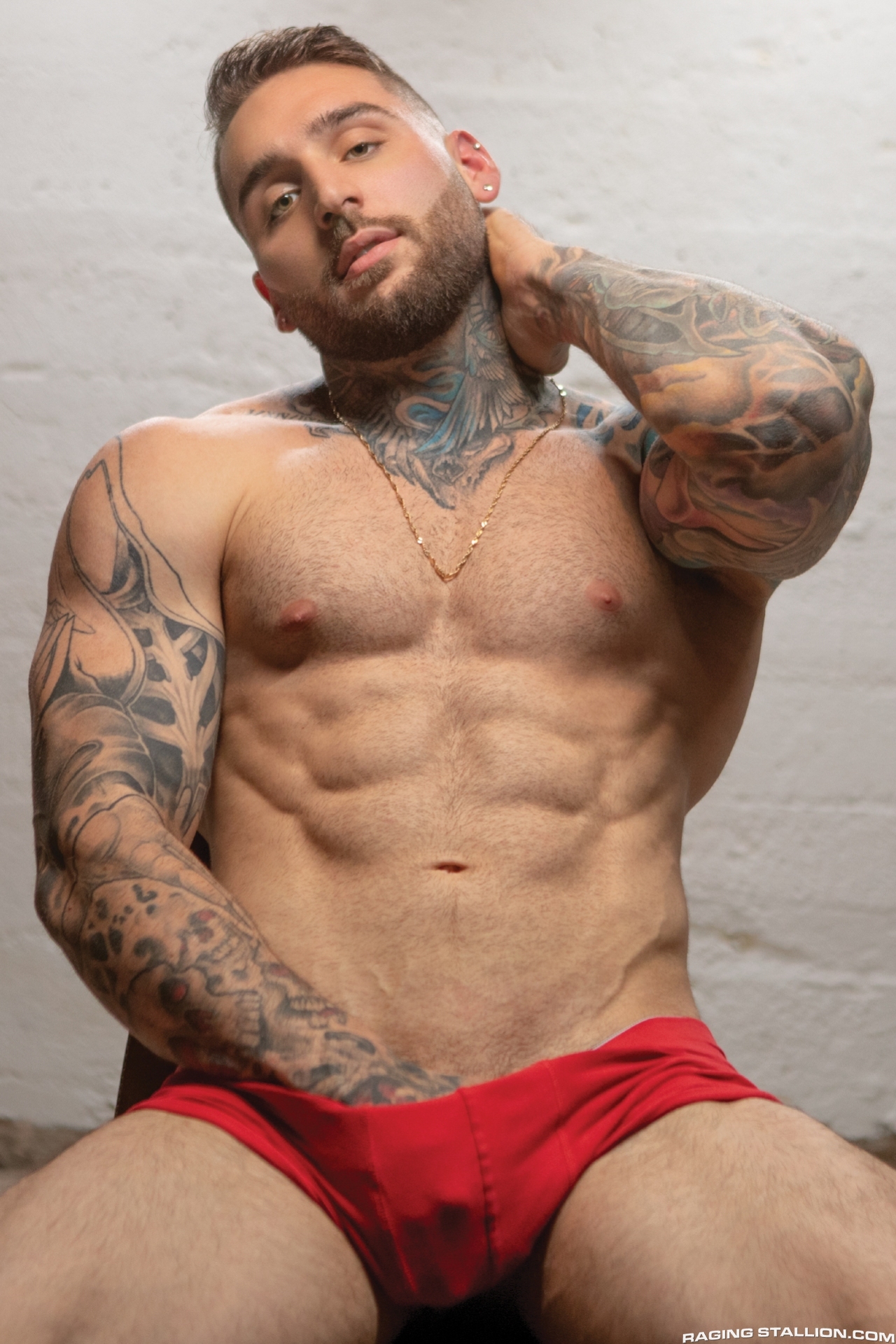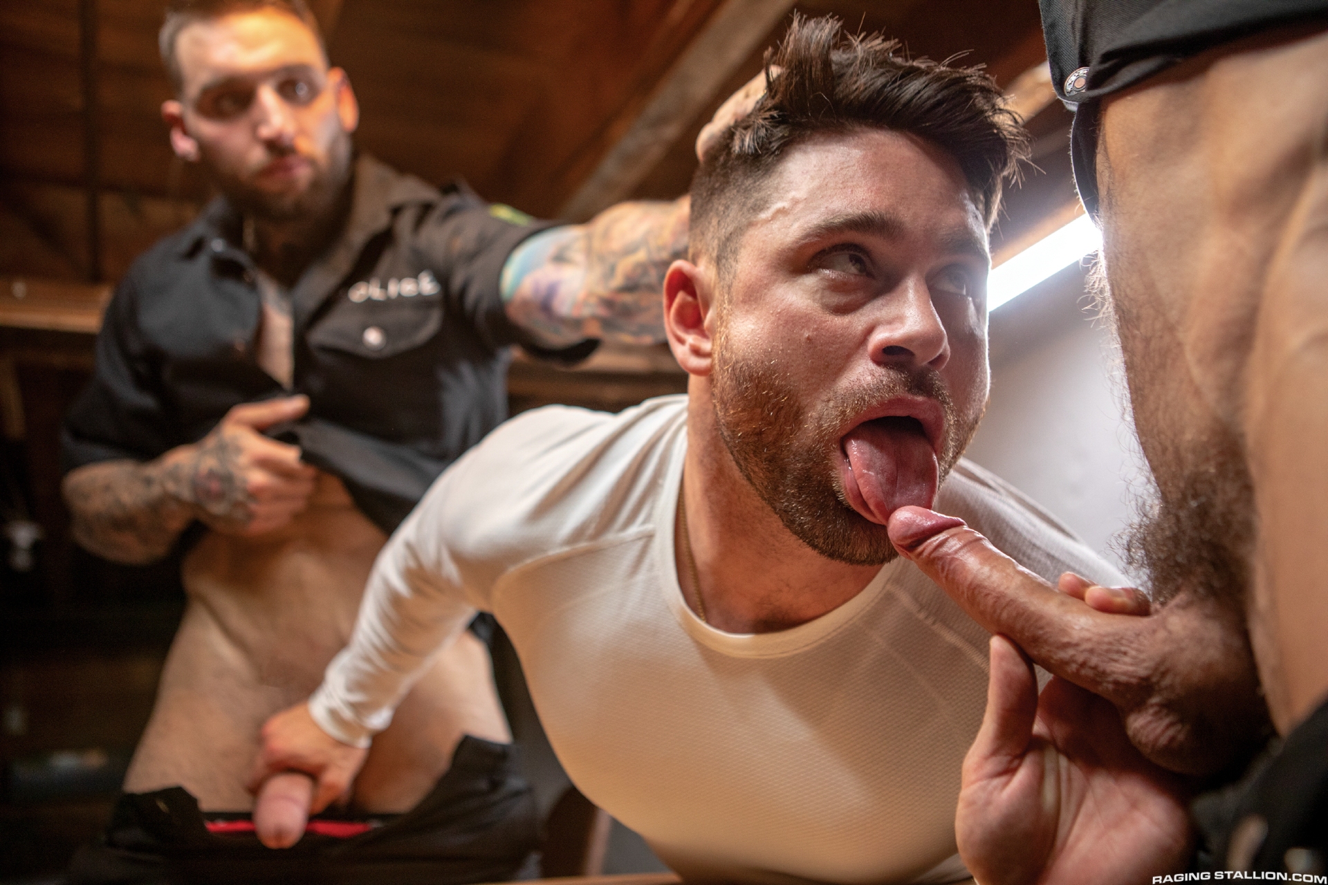 It isn't until the aggressive officers pull out their hard cocks that Beau finally opens his mouth. With the hairy racer bent over the interrogation room table, officer Tony warns Beau that if he doesn't start talking, they're going to bareback his hole.
