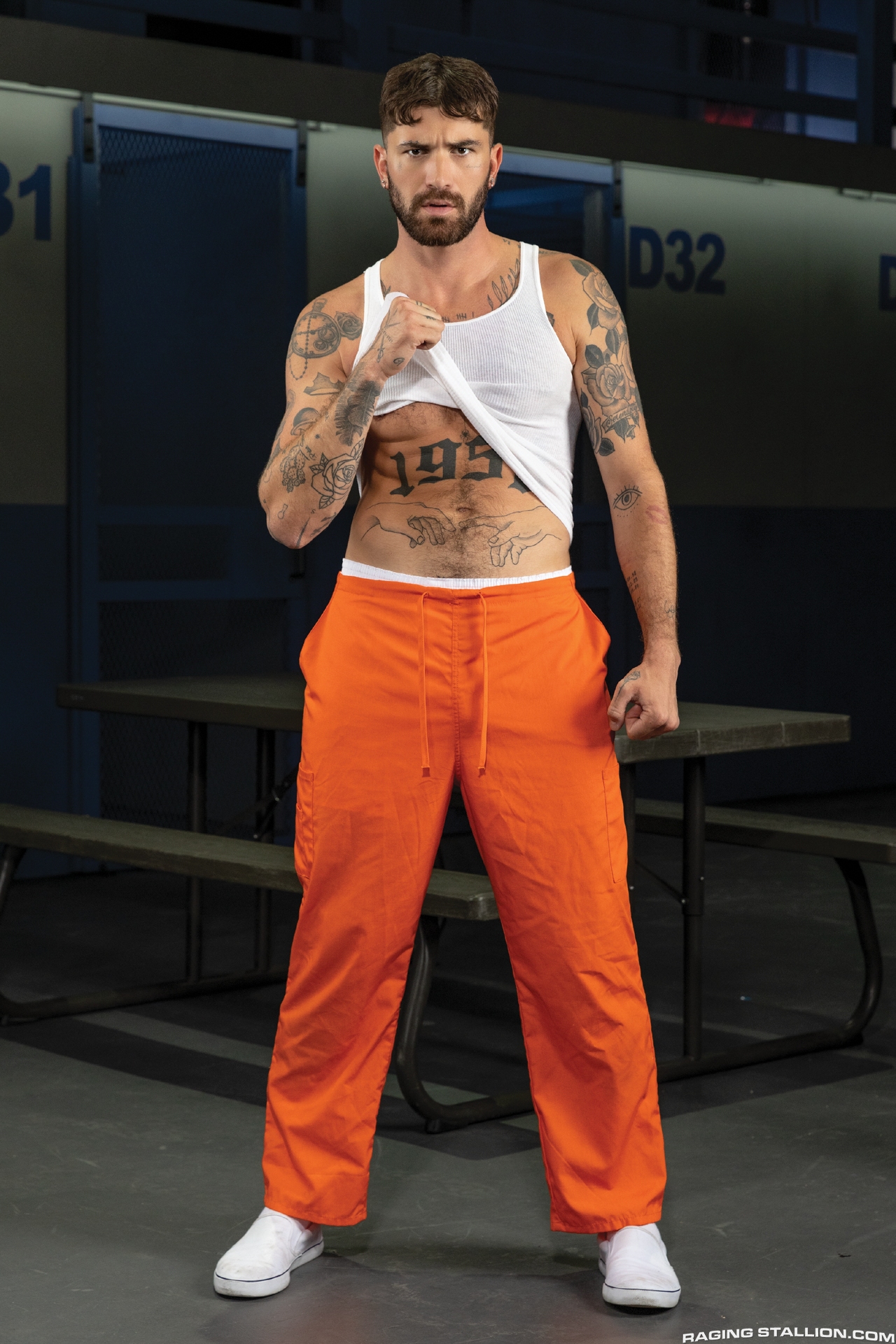 After going for Travis's dick and balls again, Chris spreads the DA's smooth cheeks and drills the lawyer's tight pink hole with his fingers and tongue. Now open and ready, Travis gets on all-fours for a bareback doggie-style pounding. Without missing a pace, Chris continues to fury-fuck the man who locked him up, jamming his big cock in and out of Travis's ass.