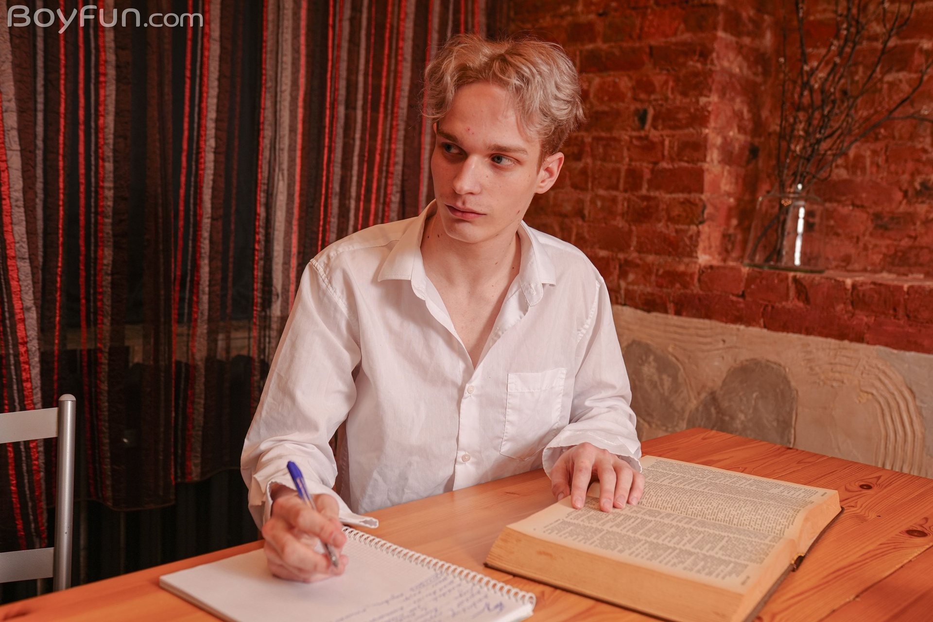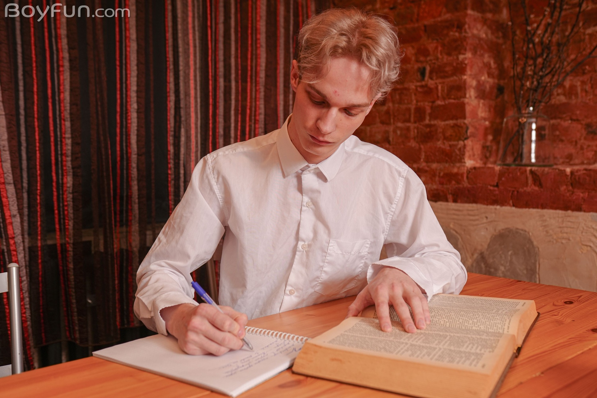 Description: Studious blond twink Alex Rosa is hard at work when his peace is momentarily interrupted by an arriving fellow blond boy. Dean Slim is here to work, too, but it seems he's providing a considerable distraction for Alex. He can't stop checking out his new neighbor, but his desire soon spills over when he brazenly heads under the table to grope the package between the other boy's legs!