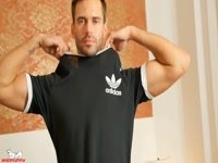 Our latest new-comer is Budapest born Antonio de Luca, and he’s got one rocking body. Antonio is a personal trainer who spends his free time in the gym keeping his body in top shape. He slowly strips out of his shirt; his abs and pecs rock hard with not a hint of visible fat. He continues with his underwear; his cock already rock hard before the underwear comes off. Sitting back on the sofa, Antonio grabs his cock and starts jacking it as he massages his lean, muscular chest. He pulls back his legs; spreading his ass and his fingers go right up his sweet, tight hole while continuing to whack off. The more he whacks his cock, the more intense and tight his body becomes. As he gets close to cumming Antonio stands up; almost rocking back and forth on the balls of his feet. His nuts; along with the grip on his cock, tighten and with a bottled up intensity Antonio starts squirting thick loads of jizz all over the floor. Too bad there was no one laying there under him.
